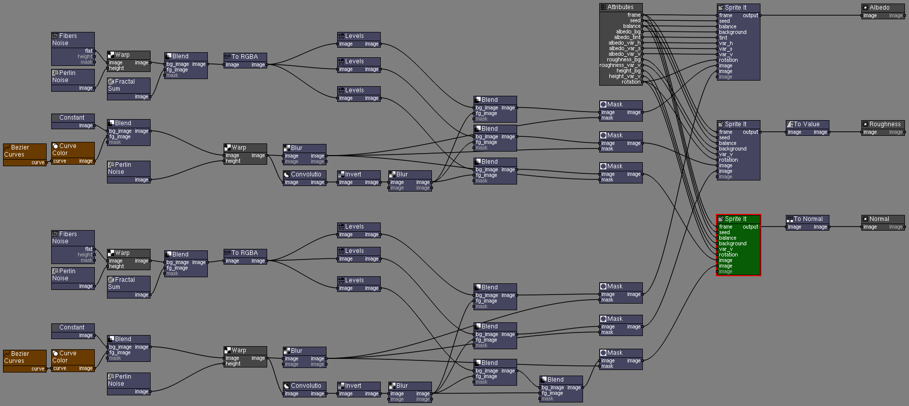 - Blend, Mask and Blur nodes to texturize the wood strands.