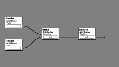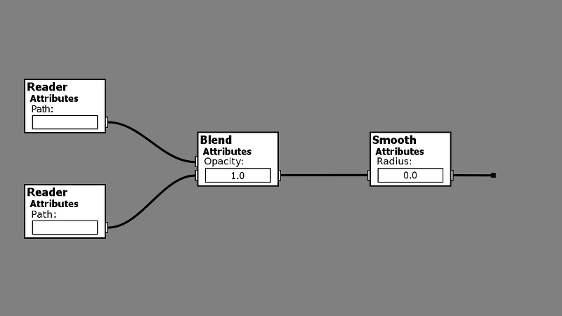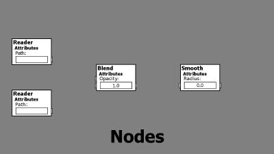 Nodes can have no input, as the Generate: Reader node, which reads a bitmap from disk and returns an image to the graph output. Nodes can have no output, as the Writer node, which is used by the user interface to display the final image.