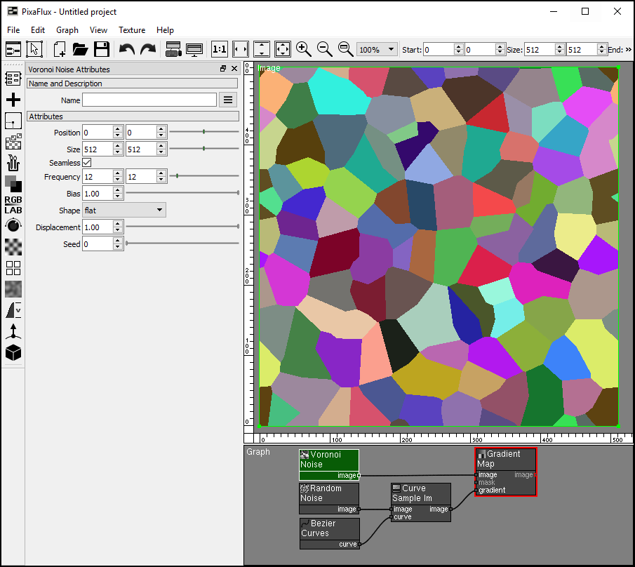 - Connect [Voronoi Noise > image] to [image > Gradient Map] [?].